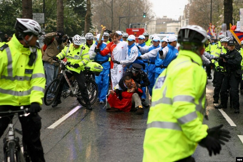 Һәр урында диярлек аны Кытайда кеше хокуклары бозылуга протест белдерүчеләр каршы ала. Алар утның юлына төшә, аны сүндерергә тырыша, "Азат Тибет!", "Коммунистик Кытайга юк!" дигән шигарләр кычкыра.