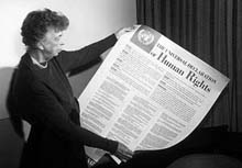 Декларацияне әзерләү өчен җаваплы комиссиянең беренче рәисе Элеонор Рузвельт җыенда катнашучылар алдында чыгыш ясый.