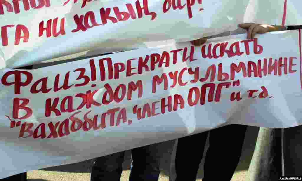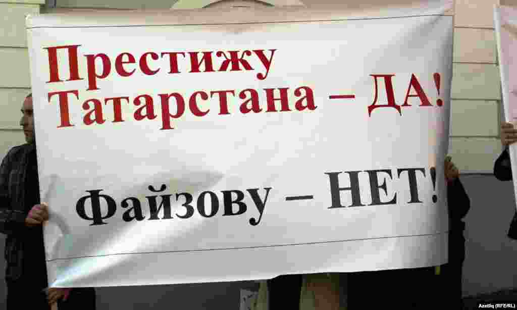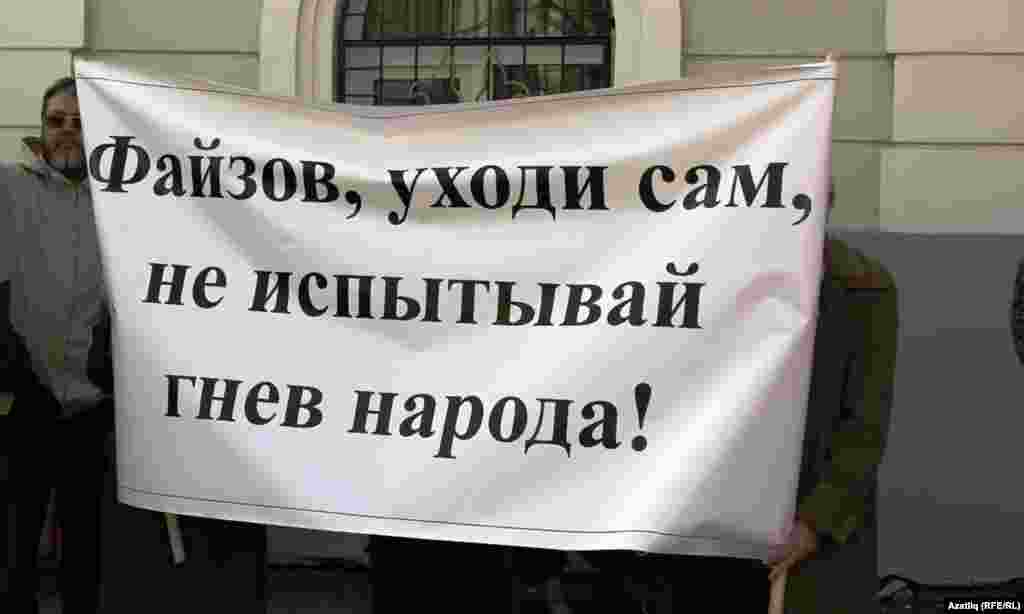 Казанда Татарстан мөселманнарының диния идарәсе бинасы каршында мөфти Илдус Фәизгә каршы пикет узды. Күп кенә шигарьләр күтәреп чыккан мөселманнарның төп таләбе – мөфтинең вазифасыннан китүе иде. Апрель башында Илдус Фәиз “Кол Шәриф” мәчете имамы Рамил Юнысны вазифасыннан алып үзен имам дип игълан иткәннән соң, мөселманнарның мөфтигә карата ризасызлыгы кисәк көчәеп китте. Мөселманнар басымы астында Илдус Фәиз әлеге карарыннан чигенергә мәҗбүр булды. [Рамил Сафин фотолары]