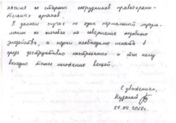 Кудакаев төрмәдә аңа басым ясалуга зарланып хат язган. Рус телендә язылган бу хатның эчтәлеге түбәндәгечә.