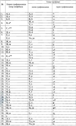 Татар телендә кирил хәрефләренең латин һәм гарәп графикасында язылышы (канунга кушымта):