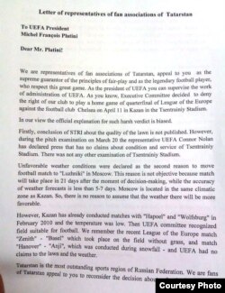 Казан җанатарларының UEFA президенты Мишель Платинига хаты 25 мартта дөнья күрде. Спорт сөючеләр шул хатта “Рубин”-“Челси” уенын Мәскәүдән Казанга күчерүне сорый.