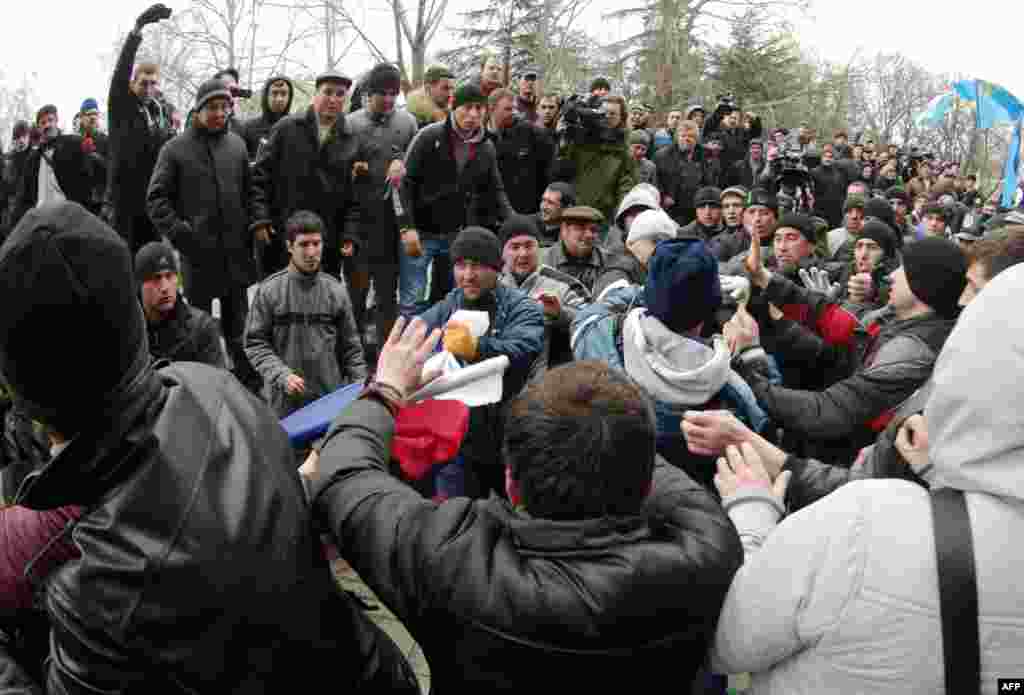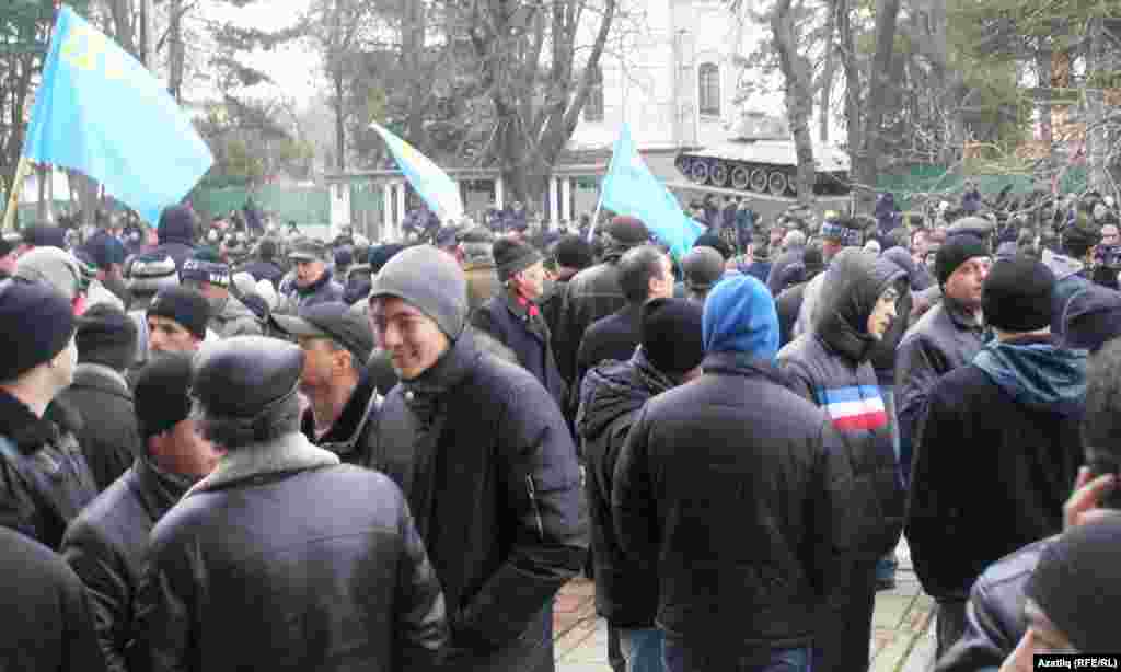 Кырым Югары радасы янына Украинаның бербөтенлеген яклаучы кырымтатарлар җыелыр алдыннан Кырымны Русиягә кушу яклы активистлар анда килеп басты һәм кырымтатарларны якын җибәрмәячәкләрен белдерде.