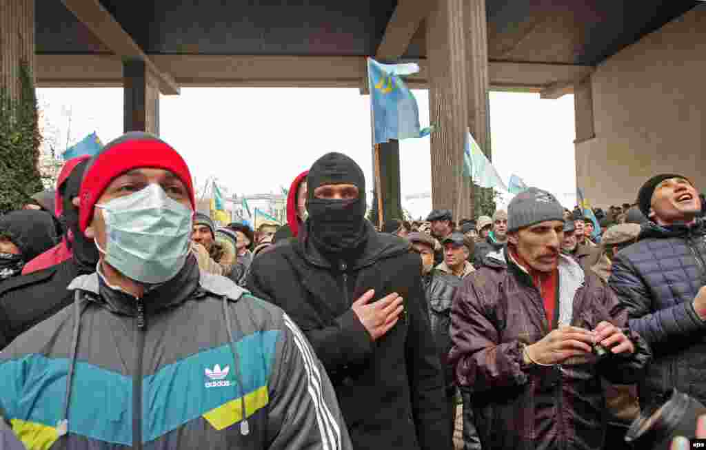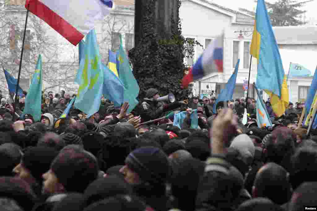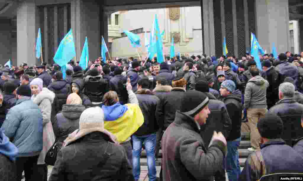 Чәршәмбе Кырымның Югары Радасы бинасы янына илнең яңа хакимиятен тану таләбе белән төбәктәге кырымтатарлар җыелды. Алар Кырымны Украинадан аерып Русиягә кушу тырышлыкларына каршы чыга. Кырым Радасы чираттан тыш утырышта Украинада хакимият алышынгач илдәге вазгыятьне тикшерә. Кырымны Русиягә кушу тарафдарлары шунда ук үз җыеннарын үткәрә.