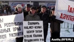 Кулларда “Нурмөхәммәт Хөсәеновны вазифасына кайтарыгыз!”, “Татар гимназияләре ачуны, телевидение, радиода татар тапшырулары оештыруны таләп итәбез!”, “Татар теленә – дәүләт статусы!”, “Бүздәк районының Килем татар мәдәни үзәген саклауны таләп итәбез!”, “Нурмөхәммәт Хөсәеновны вазифасыннан алучыларны җаваплылыкка тарттырырга!”, “Татар гимназиясеннән кулыңны ал!” кебек шигарләрне күрергә була иде.