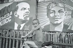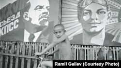 "Монысы совет агитациясе фонында төшерелгән авыл кешесе. Бөтен эшләп чыгарылган ит, бөтен икмәк республикадан алып кителә иде, шуңа күрә авылларда тормыш артык бай түгел иде, шулай дип әйтик. Һәм менә бу трусикчан гына малай шушы плакатлар каршында төшереп алынган. Агитация бик көчле алып барыла иде, СССРда аңа акча җәлләмәделәр. Шундый уйлап чыгарылган, матур тормыш иде. Ә янәшәдә бөтенләй башка тормыш, чын тормыш. Һәм менә бу малай нәкъ шул тормышның билгесе булып басып тора".