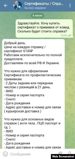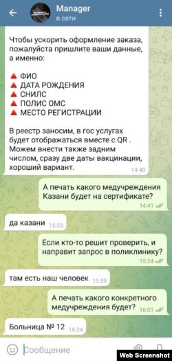 Русия куәт структураларының контролендә булмаган дип саналучы Telegram каналларда ялган сертификатлар табу - иң җиңеле. Беренче итеп "КУПИТЬ🔥СПРАВКУ🔥 КАЗАНЬ" дип аталган төркемгә юлыгасың. Анда 200дән артык кеше утыра. Модератор белән сөйләшү барышында аларның бөтен Русия һәм Украина буйлап эшләве билгеле булды. Казан хастаханәләренең мөһере сугылган сертификат та бирүләрен әйттеләр.