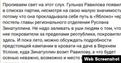 "Бу имеш-мимешкә ачыклык кертәбез. Гөлназ Равилова әллә ни билгеле шәхес булмаса да партия исемлегендә пәйда булды, чөнки ул "Яблоко" фиркасенә партиянең төбәк бүлеге башлыгы Руслан Зиннәтуллин ятагы аша юл салды. Аның республикадан читтә дә ярдәмчеләре бар дип сафсата сөйләргә кирәкми, ул ярдәмчеләре монда аның. Әлегә җәй булганда, киләсе сайлау кампаниясе нечкәлекләрен Зиннәтуллин Равилованы алып йөргән Югары Осландагы дачада тикшерергә мөмкин. Ә көздә бу эшләрнең ничек тәмамланасы мөһим дә түгел, бәлки, әле партиядәге ул урынның бөтенләй кирәге калмас", дип яза "Бабай позвонит" телеграм каналы.