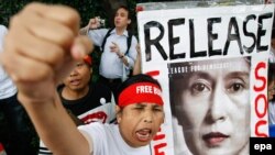 “Анг Сан Чине иреккә чыгарыгыз. Без демократия телибез”, дигән шигарь кычкырды протестчылар.